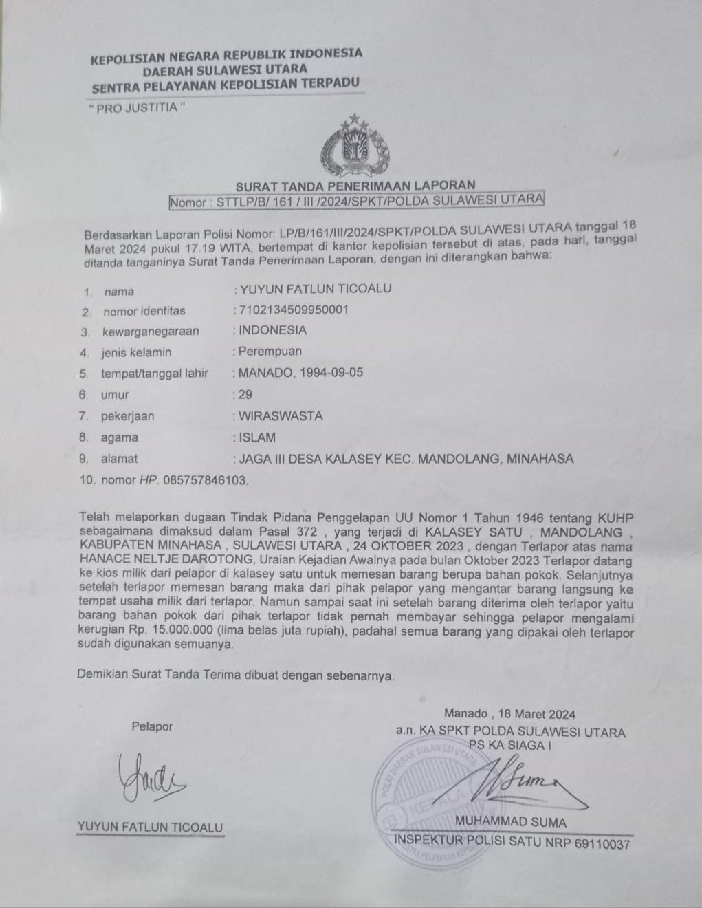 Dengan Berdasarkan laporan polisi Nomor.LP/B/161/lll/2024/SPKT/POLDA SULAWESI UTARA tanggal 18 maret 2024 pukul 17.19.bertempat dikantor kepolisian tersebut , laporan di terima Dengan KUHP 372 Dengan laporan Yuyun fatlun ticualu karena di telpon tidak aktif Pelapor Menggagap Tidak punya etikat baik.